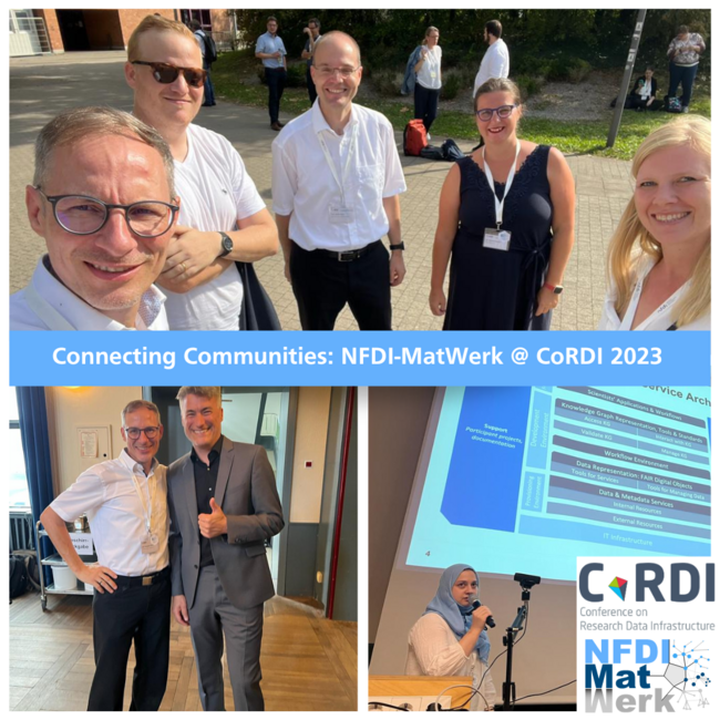 Since the commencement of CoRDI on 12th September 2023, our consortium, NFDI-MatWerk, has been actively participating in the conference. Today, on its concluding day, Prof. Dr. Harald Sack of the Task Area Ontologies from FIZ Karlsruhe elucidated the topic “Knowledge Graph-based RDM Solutions: NFDI4Culture – NFDI-MatWerk – NFDI4DataScience” during the "Linking RDM" session. What is the presentation about? Drawing from our involvement in the NFDI4Culture and NFDI-MatWerk projects, we've proposed a generalized knowledge graph-centric RDM solution suitable for various consortia. This solution entails creating a unified NFDI core ontology tailored to individual domains, forming the foundation of a knowledge graph (KG) that details consortium-specific research data and software assets. Serving as the backbone of a web portal, this KG facilitates seamless data access and management. While this solution is operational for NFDI4Culture and soon to be integrated by NFDI-MatWerk, it sets a precedent that could be replicated by other consortia. Our initiatives are currently in alignment with the ongoing endeavours to incorporate a knowledge graph in NFDI4DataScience.