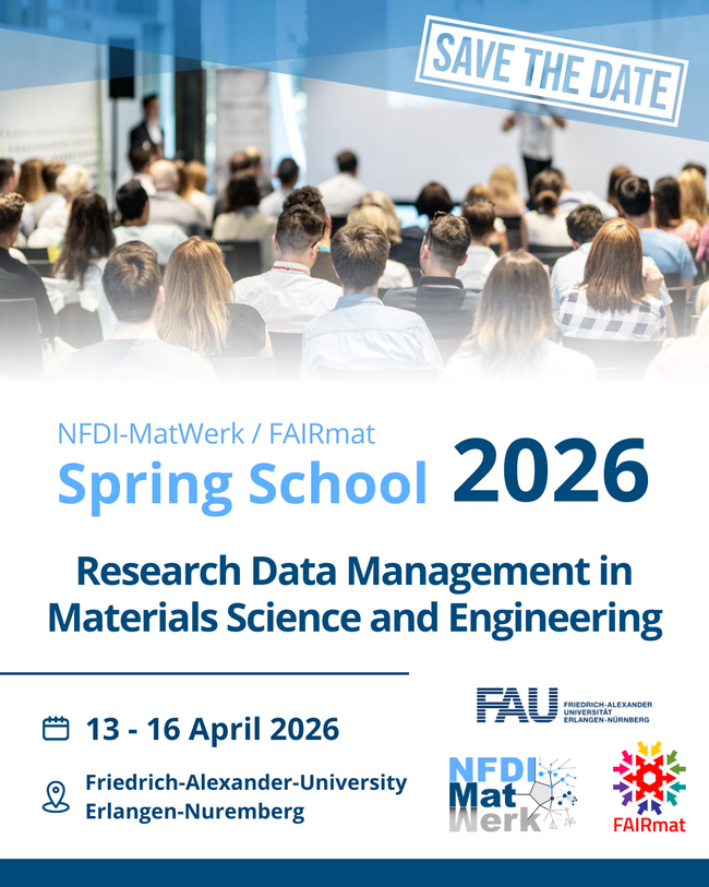 The Spring School on Research Data Management (RDM) and FAIR Data will take place from 13 to 16 of April at the University of Erlangen and the participation is free of charge. The event is co-organized by the NFDI consortia NFDI-MatWerk and FAIRmat.