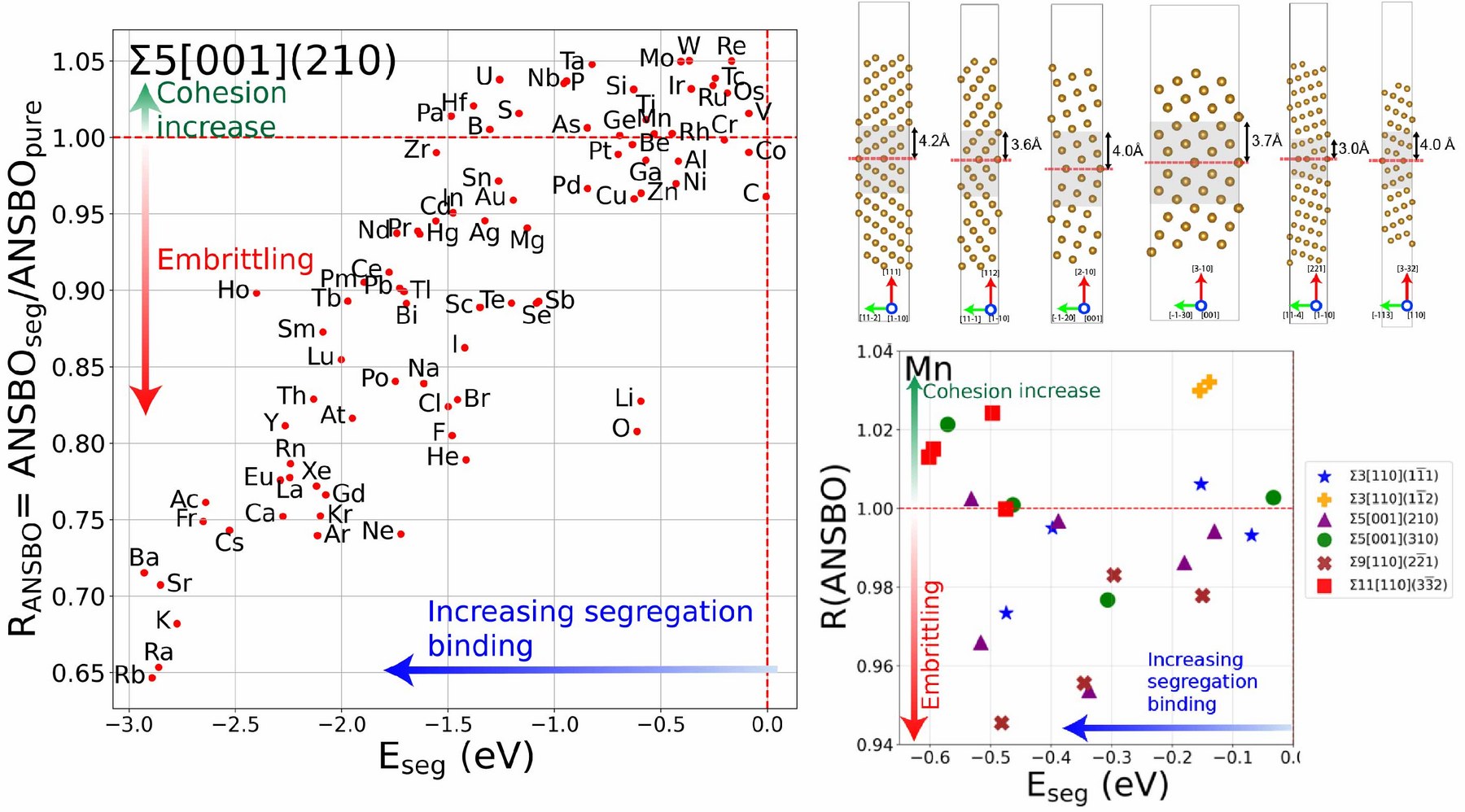 This demonstrator illustrates how pyiron workflows can be used to perform high-throughput grain boundary (GB) atomistic studies that investigate the segregation of impurities or solutes to GBs and their effects on cohesion (strengthening or weakening) — processes that are central to alloy engineering and design. It highlights how complex atomistic workflows can be executed in a fully automated, high-throughput manner to efficiently generate large datasets.